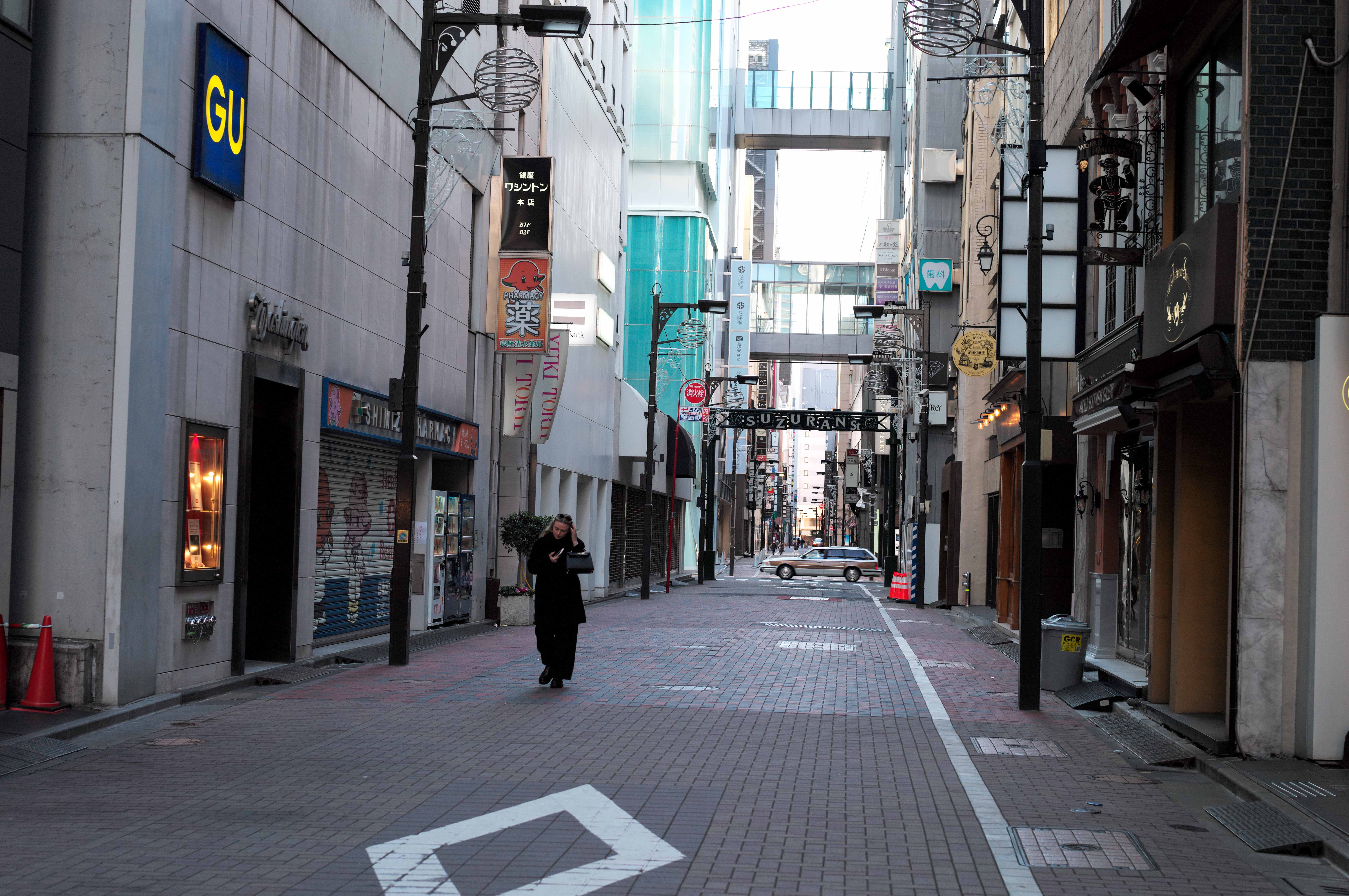閑散とした元旦のスズラン通りを、ブロンドの美女が際立たせる。背後を走るのは、知る人ぞ知るトヨタの名車だ。